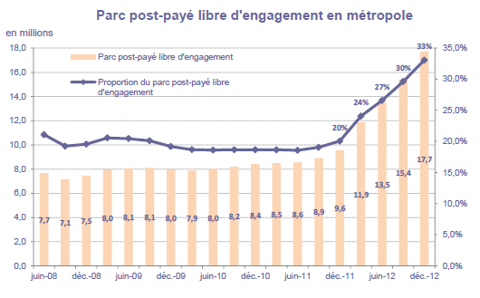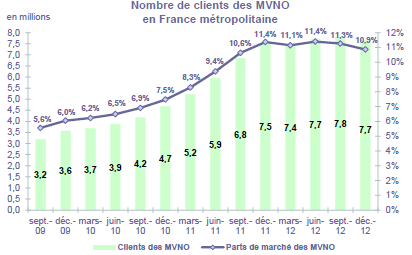 (9) La part de marché des opérateurs mobiles virtuels en ventes brutes post-payé est le rapport exprimé en pourcentage entre les ventes brutes post-payé réalisées par les opérateurs mobiles virtuels sur le trimestre et les ventes brutes post-payé totales sur ce même trimestre. La part de marché des opérateurs mobiles virtuels en ventes brutes prépayé est le rapport exprimé en pourcentage entre les ventes brutes prépayé réalisées par les opérateurs mobiles virtuels sur le trimestre et les ventes brutes prépayé totales sur ce même trimestre.