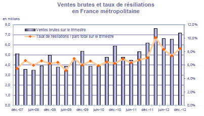 (3) Les ventes brutes sont définies comme les clients de l'opérateur en fin de trimestre dont l'enregistrement au HLR a eu lieu au cours du trimestre. Elles excluent en particulier les migrations : la migration prépayé vers post-payé correspond au cas du client qui demande au cours du trimestre à son opérateur de substituer son offre prépayé en vigueur en début de trimestre par une offre post-payé ; inversement, la migration post-payé vers prépayé correspond au cas du client qui demande au cours du trimestre à son opérateur de substituer son offre post-payé en vigueur en début de trimestre par une offre prépayé.