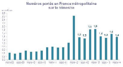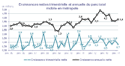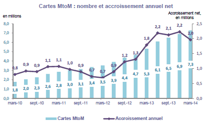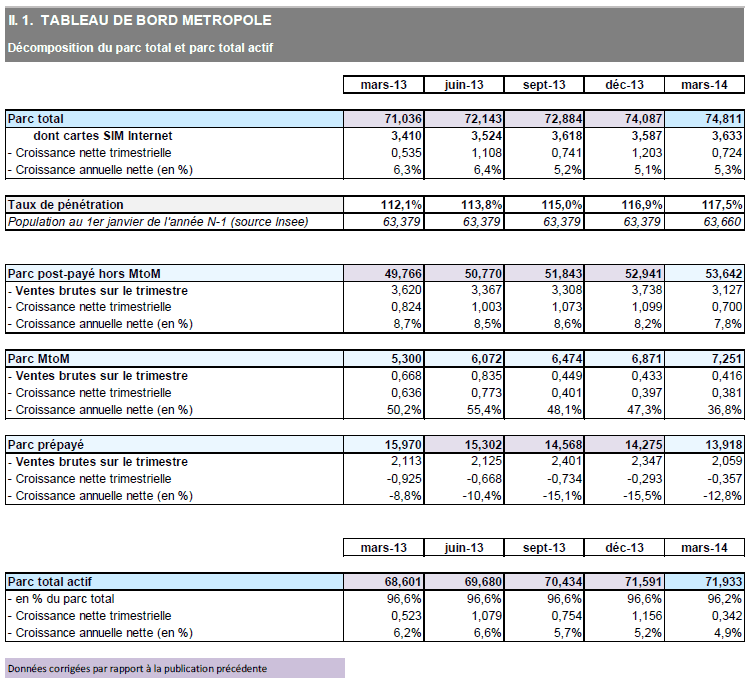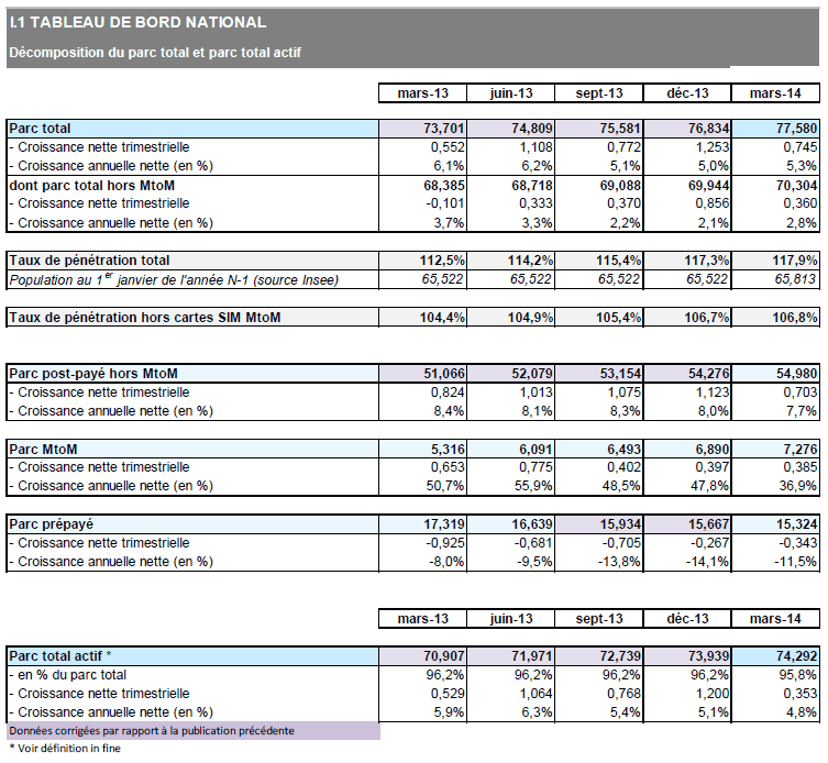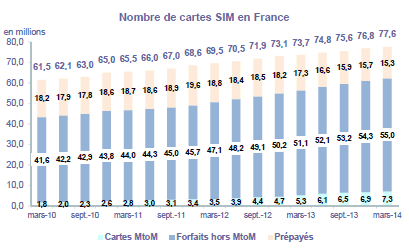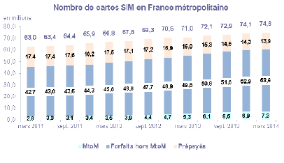 Au 31 mars 2014, le nombre de cartes SIM en service en France atteint 77,6 millions, en augmentation de 745 000 par rapport au trimestre précédent, soit une croissance supérieure à celle du premier trimestre 2013 (+550 000), et de 3,9 millions sur un an (+5,3%). Le taux de pénétration, calculé comme le ratio de l'ensemble des cartes SIM en service sur la population, s'élève à 117,9%, en croissance de 5,4 points en un an.