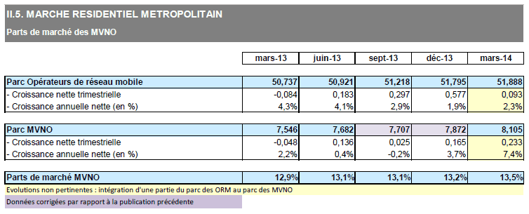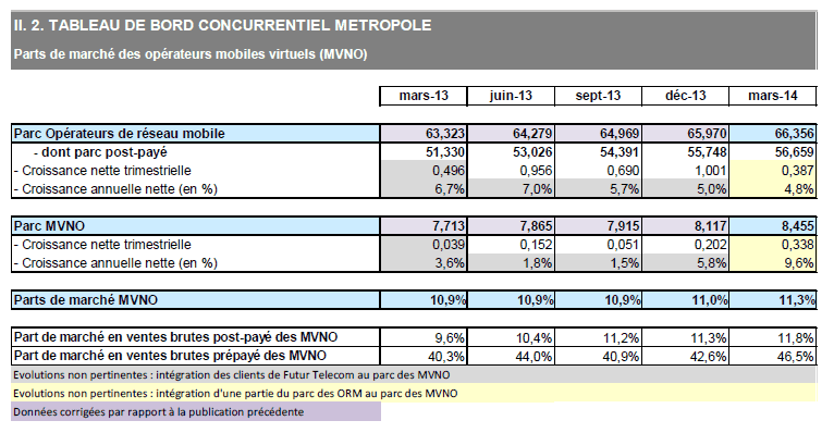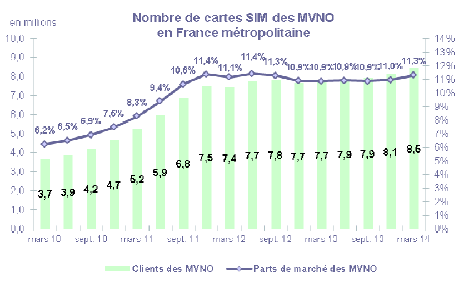 En métropole, parmi les 74,8 millions de cartes en service, 66,4 millions sont souscrites auprès des opérateurs de réseau, et 8,5 millions auprès des opérateurs virtuels (MVNO). La part de marché des MVNO s'établit à 11,3% et gagne 0,4 point en un an.