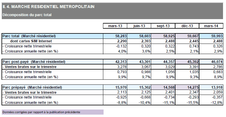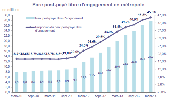 La croissance est portée par l'augmentation du nombre de forfaits : le nombre de clients ayant souscrit un forfait classique atteint 55,0 millions, en croissance de 700 000 en un trimestre. Le nombre de forfaits MtoM (7,3 millions au 31 mars 2014) a progressé de 385 000 en un trimestre. En revanche, le nombre de cartes prépayées continue de diminuer : le repli est de 345 000 en un trimestre et de deux millions en un an.