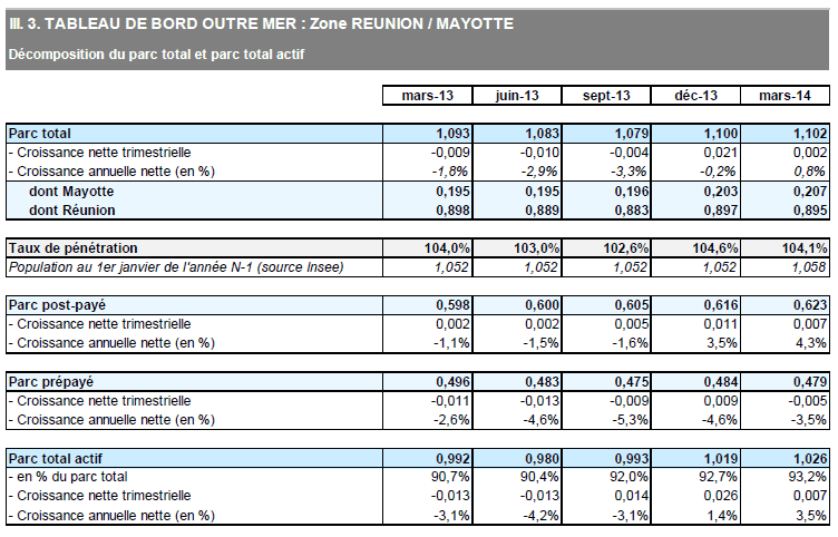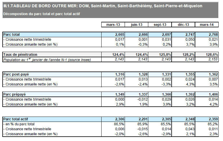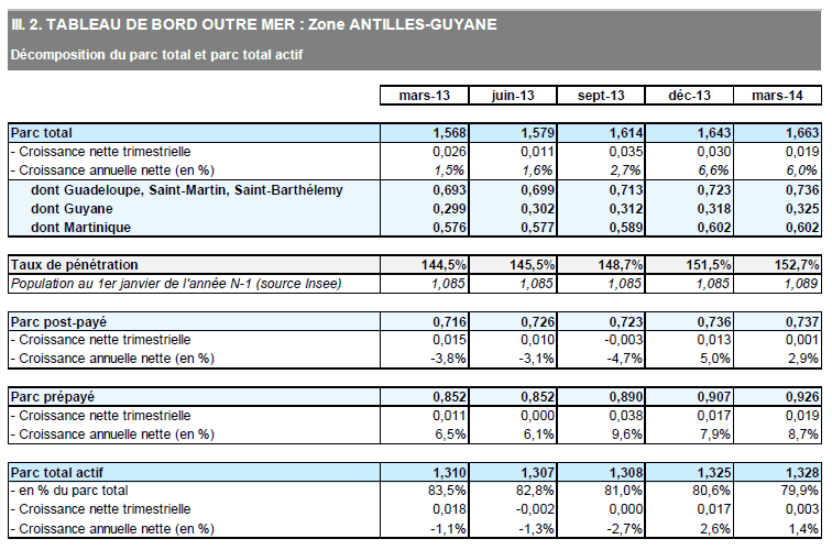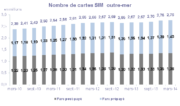 Dans les départements et collectivités d'outre-mer, le nombre de cartes SIM en service s'élève à 2,8 millions à la fin du premier trimestre 2014, en croissance de 100 000 en un an. La totalité de la croissance annuelle se fait dans la zone Caraïbes tandis que le nombre de cartes en service est quasiment stable depuis un an à la Réunion et à Mayotte (+10 000 en un an). Contrairement au marché métropolitain, le nombre de cartes prépayées continue de s'accroître (+4,2% en un an) porté par l'augmentation du nombre de clients détenteurs d'un contrat prépayé dans la zone Antilles-Guyane.