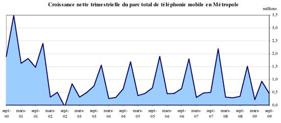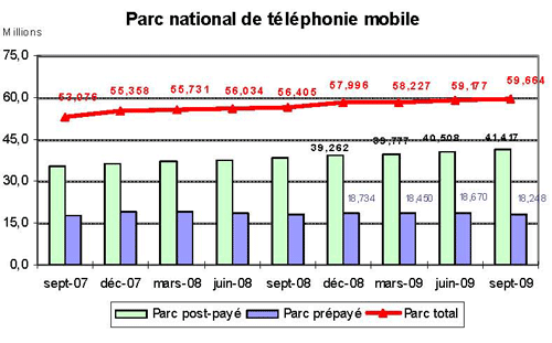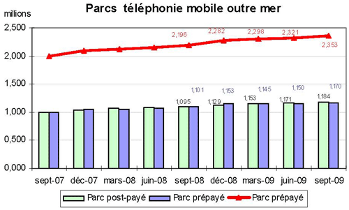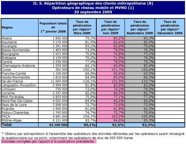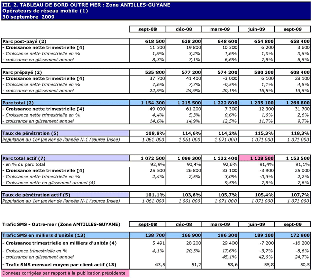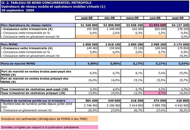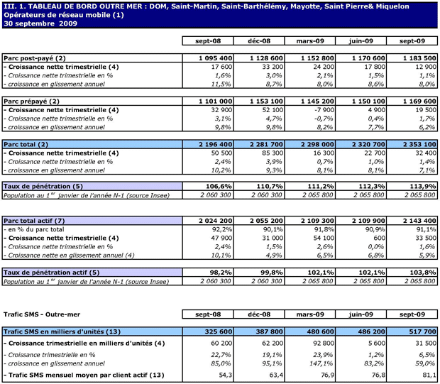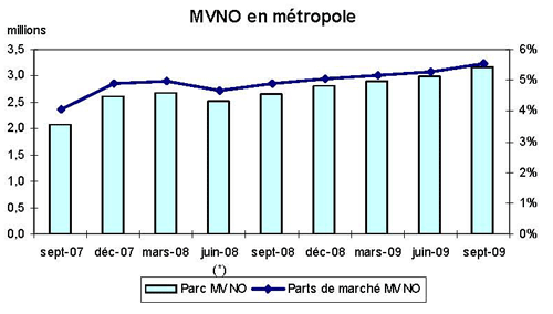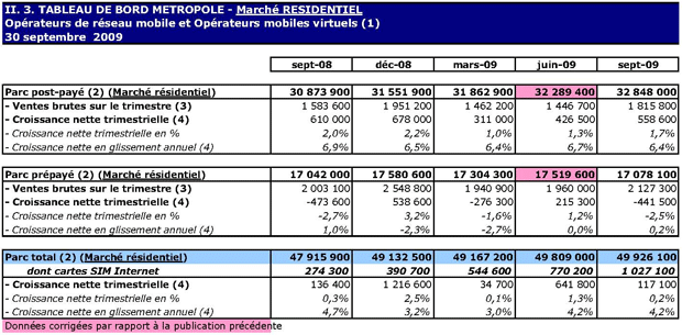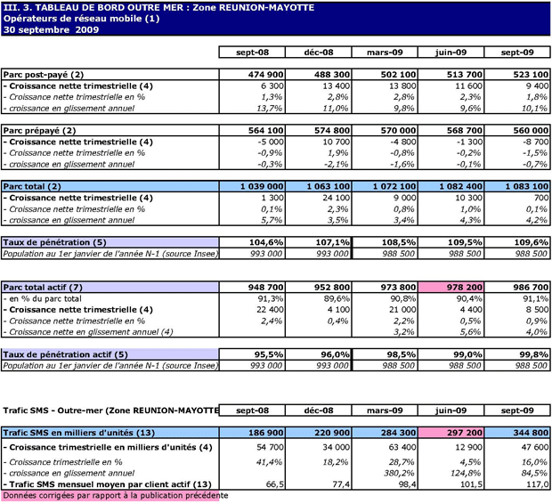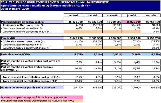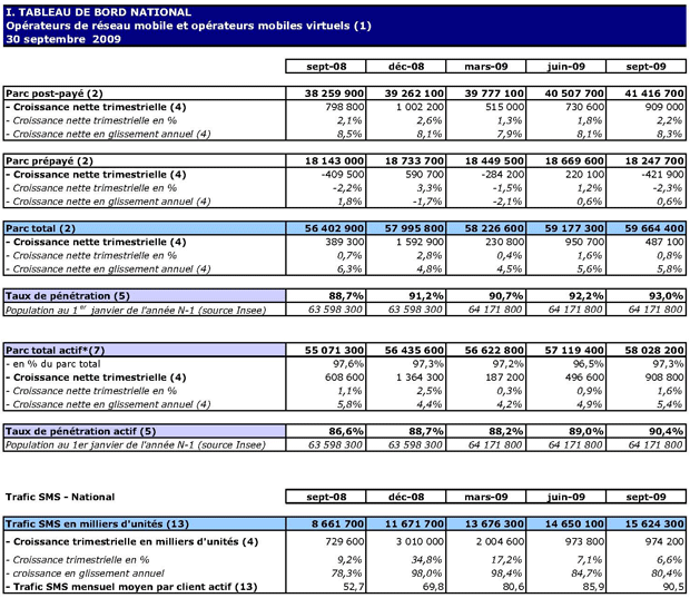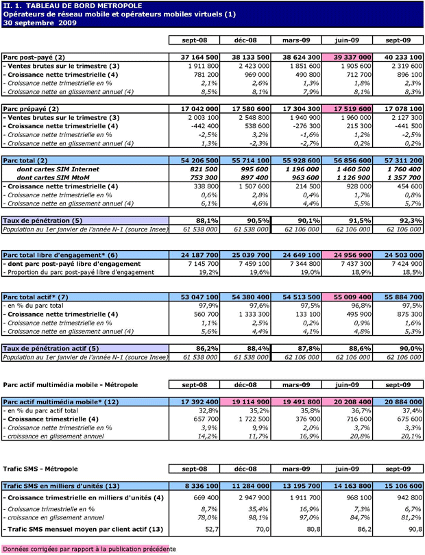 (1) Opérateurs de réseau mobile de métropole : Orange France, Société Française du Radiotéléphone (SFR), Bouygues Telecom et MVNO actifs contrôlés par les opérateurs de réseau et comptabilisés comme tels : Débitel, Ten et Neuf Cegetel. Opérateurs mobiles virtuels de métropole indépendants des ORM et actifs sur le trimestre : Afone, Auchan Télécom, Bazile Telecom, Carrefour mobile, Coriolis, E-plus, France Télécom, Mobisud, NRJ Mobile, Numéricable, Omer Telecom, Tele2, Transatel. Opérateurs de réseau mobiles outre-mer : Orange Caraïbe, filiale d'Orange France ; Orange Réunion, filiale d'Orange France ; Société Réunionnaise du Radiotéléphone (SRR), y compris sous la marque Mayotte Télécom Mobile à Mayotte, filiale de SFR ; Digicel AFG ; SAS SPM, filiale d'Orange Caraïbe à Saint Pierre et Miquelon ; Dauphin Telecom ; Outremer Telecom ; UTS Caraïbe.