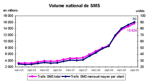 (13) Le trafic trimestriel de SMS ("Short Message Service") correspond à l'ensemble des SMS envoyés (SMS sortants) sur le trimestre. Les données relatives à St-Pierre et Miquelon ne sont pas prises en compte. Le trafic SMS mensuel par client actif moyen correspond au trafic trimestriel de SMS divisé par 3, rapporté au parc de clients actifs moyen ((Parc de clients actifs de la fin du trimestre précédent + Parc de clients actifs de la fin du trimestre considéré)/2).