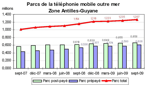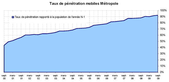 (5) Le taux de pénétration est obtenu en divisant le nombre total de clients ou le nombre de clients "actifs" par la population considérée. La publication du SIM effectuée en décembre 2006 a réactualisé les populations issues du recensement décennal de l'INSEE en date du 1er janvier 1999. Désormais la population de référence est celle publiée par l'Insee au 1er janvier de l'année considérée, sans réactualisation rétroactive. Au 1er janvier de l'année N, l'Insee publie les estimations de population du 1er janvier de l'année N-1. Ainsi, la population de référence en 2009, issue des estimations publiées en janvier 2009 (et donc portant sur la population au 1er janvier 2008), comprend une population métropolitaine de 62 106 000 personnes, à laquelle s'ajoute, au titre des DOM, une population de 2 065 800 personnes, se décomposant notamment en 1 071 000 personnes pour la zone Antilles-Guyane et 788 500 pour la zone Réunion-Mayotte.