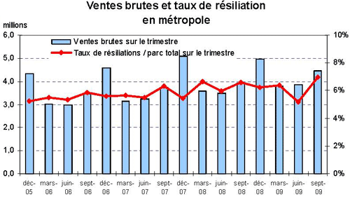 (10) Le taux de résiliation post-payé trimestriel est le rapport entre les résiliations post-payé du trimestre et le parc moyen post-payé sur la période la (demie somme des parcs post-payé en début et en fin de trimestre). Le taux de résiliation prépayé trimestriel est le rapport entre les résiliations prépayé du trimestre et le parc moyen prépayé sur la période (demie somme des parcs prépayé en début et en fin de trimestre). A noter qu'une résiliation se définit comme un client de l’opérateur en début de trimestre dont l’enregistrement au HLR a été effacé au cours du trimestre. Les modifications de l’enregistrement au HLR ne constituent pas, en particulier, des résiliations. Cette définition ne recouvre donc ni les changements d’offres au sein de la gamme, ni les migrations prépayé vers post-payé ou post-payé vers prépayé, ni les suspensions de services.