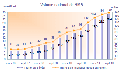 (13) Le trafic trimestriel de SMS ("Short Message Service") correspond à l'ensemble des SMS envoyés (SMS sortants) sur le trimestre. Les données relatives à St-Pierre et Miquelon ne sont pas prises en compte. Le trafic SMS mensuel par client actif moyen correspond au trafic trimestriel de SMS divisé par 3, rapporté au parc de clients actifs moyen ((Parc de clients actifs de la fin du trimestre précédent + Parc de clients actifs de la fin du trimestre considéré)/2).