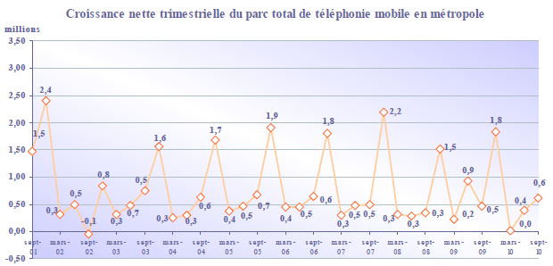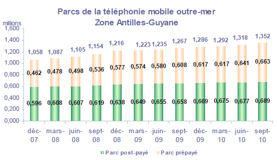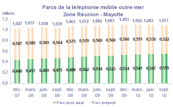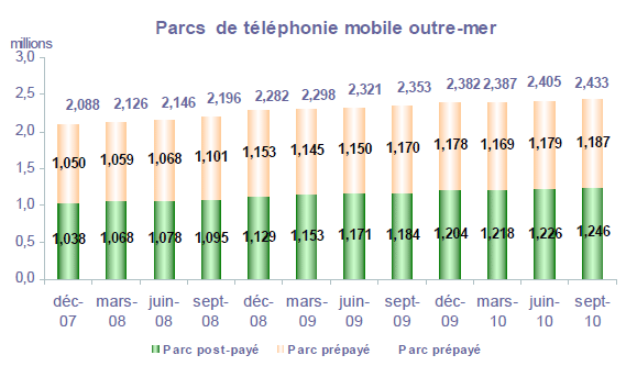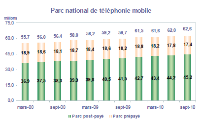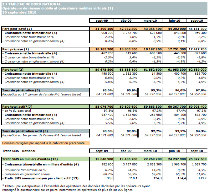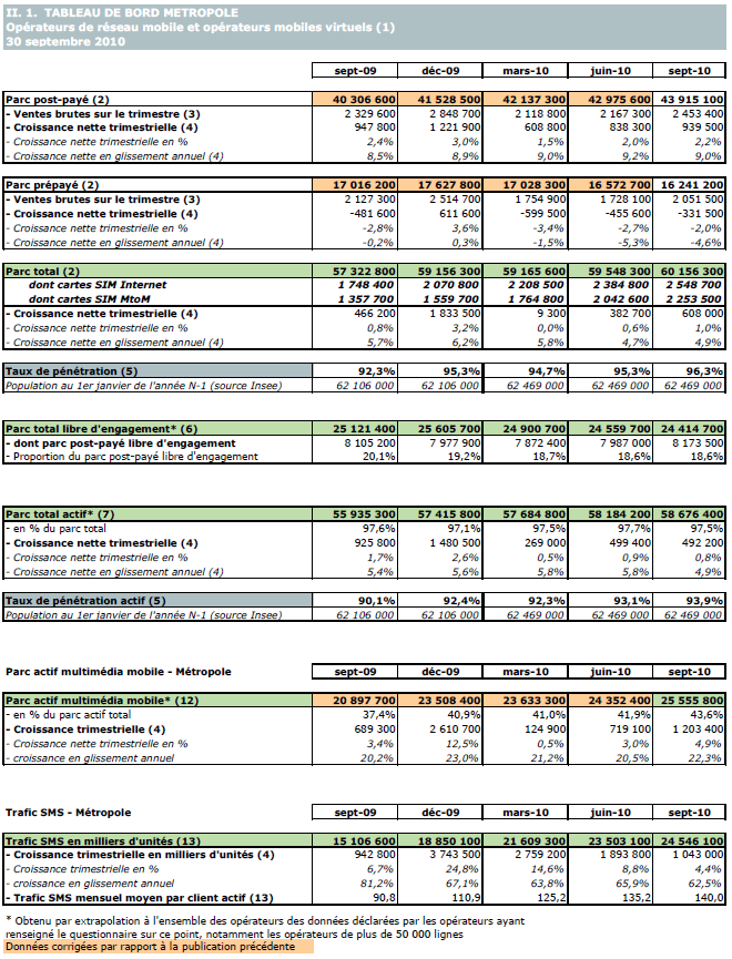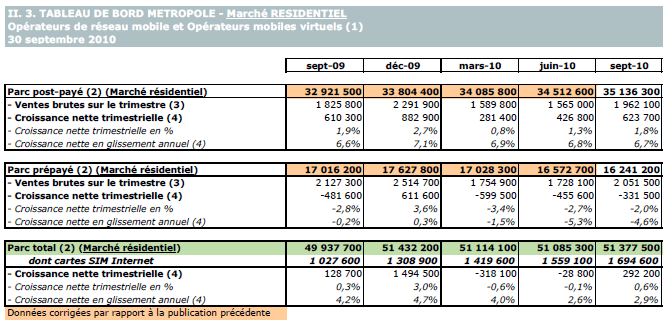Note : les données relatives aux parcs post-payé et prépayé en métropole (et par conséquent le parc national) diffèrent de la publication précédente sur la période de juin 2009 à juin 2010. Plusieurs modifications effectuées par les opérateurs sur le parc des clients (changement dans la répartition entre post-payé et prépayé, meilleure prise en compte de forfaits bloqués), ainsi que l'intégration d'un nouvel opérateur, expliquent ces corrections.