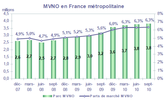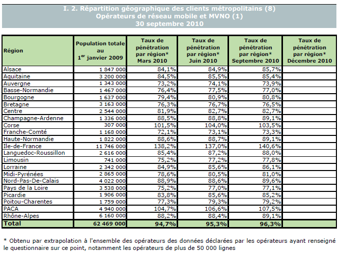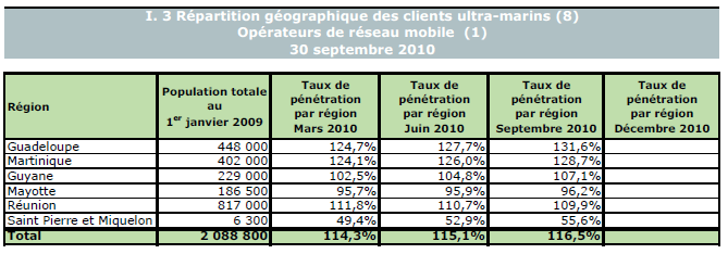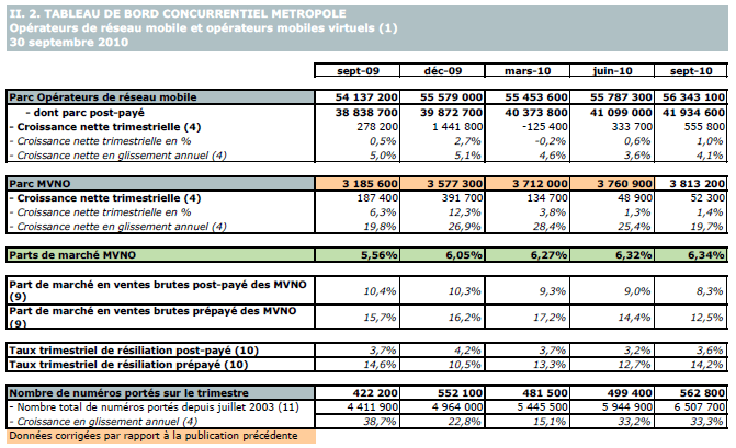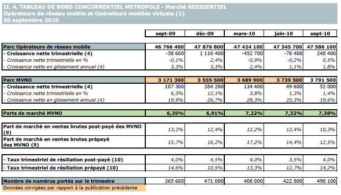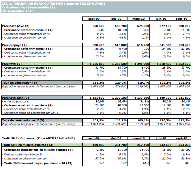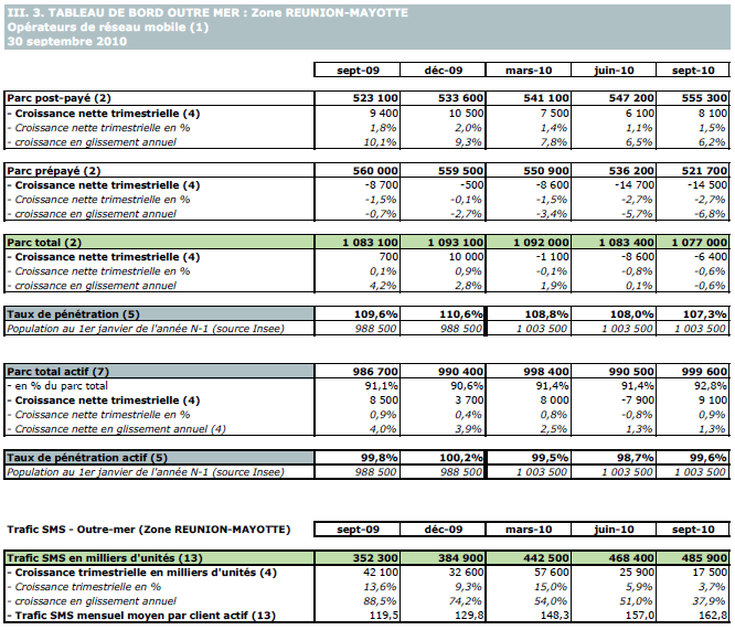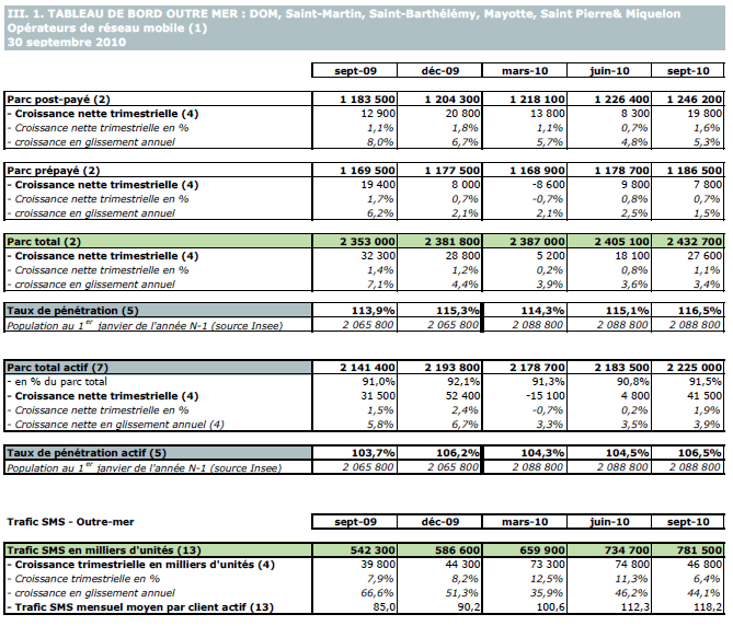 (1) Opérateurs de réseau mobile de métropole : Orange France, Société Française du Radiotéléphone (SFR), Bouygues Telecom et MVNO actifs contrôlés par les opérateurs de réseau et comptabilisés comme tels : Debitel, Mobisud, Ten et Neuf Cegetel. Opérateurs mobiles virtuels de métropole indépendants des ORM et actifs sur le trimestre : Afone, Auchan Télécom, Bazile Telecom, Carrefour mobile, Coriolis Télécom, E-plus, France Télécom, NRJ Mobile, Numéricable, Omer Telecom, Prixtel, Sim +, Sisteer, Omer mobile, Transatel, Zéro forfait. Opérateurs de réseau mobiles outre-mer : Orange Caraïbe, filiale d'Orange France ; Orange Réunion, filiale d'Orange France ; Société Réunionnaise du Radiotéléphone (SRR), y compris sous la marque Mayotte Télécom Mobile à Mayotte, filiale de SFR ; Digicel AFG ; SAS SPM, filiale d'Orange Caraïbe à Saint Pierre et Miquelon ; Dauphin Telecom ; Outremer Telecom ; UTS Caraïbe.
