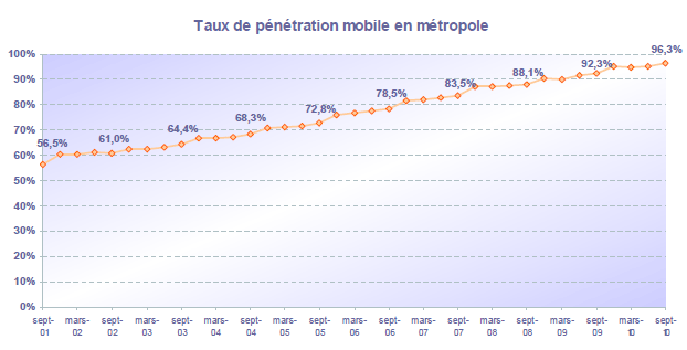 (5) Le taux de pénétration est obtenu en divisant le nombre total de clients ou le nombre de clients "actifs" par la population considérée. La publication du SIM effectuée en décembre 2006 a réactualisé les populations issues du recensement décennal de l'INSEE en date du 1er janvier 1999. Désormais la population de référence est celle publiée par l'Insee au 1er janvier de l'année considérée, sans réactualisation rétroactive. Au 1er janvier de l'année N, l'Insee publie les estimations de population du 1er janvier de l'année N-1. Ainsi, la population de référence en 2010, issue des estimations publiées en janvier 2010 (et donc portant sur la population au 1er janvier 2009), comprend une population métropolitaine de 62 469 000 personnes, à laquelle s'ajoute, au titre des DOM, une population de 2 088 800 personnes, se décomposant notamment en 1 079 000 personnes pour la zone Antilles-Guyane et 1 003 500 pour la zone Réunion-Mayotte.
