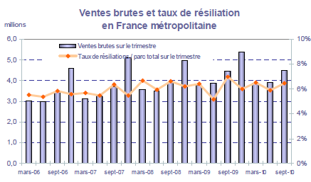 (3) Les ventes brutes sont définies comme les clients de l'opérateur en fin de trimestre dont l'enregistrement au HLR a eu lieu au cours du trimestre. Elles excluent en particulier les migrations : la migration prépayé vers post-payé correspond au cas du client qui demande au cours du trimestre à son opérateur de substituer son offre prépayé en vigueur en début de trimestre par une offre post-payé ; inversement, la migration post-payé vers prépayé correspond au cas du client qui demande au cours du trimestre à son opérateur de substituer son offre post-payé en vigueur en début de trimestre par une offre prépayé.