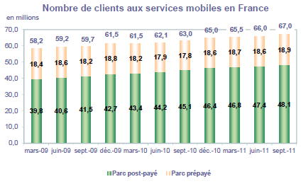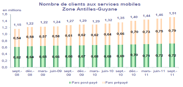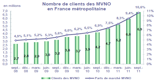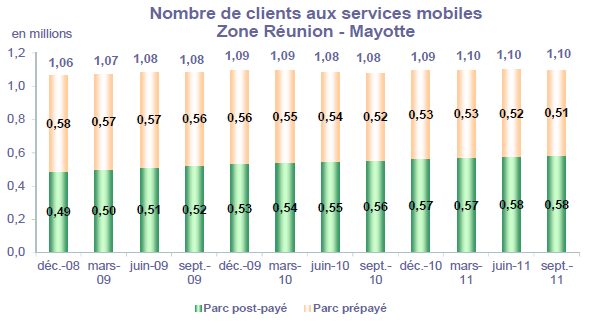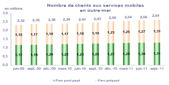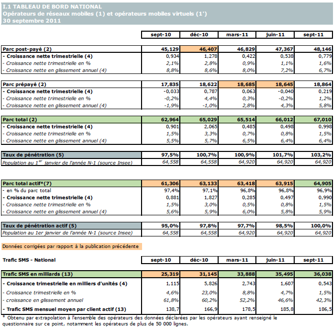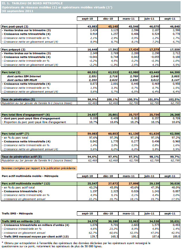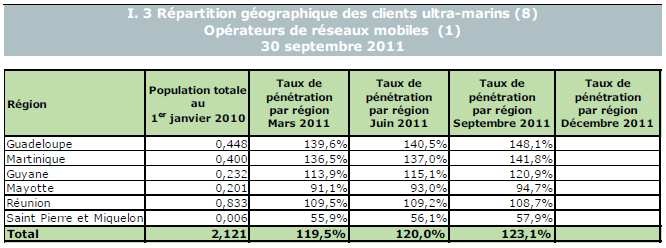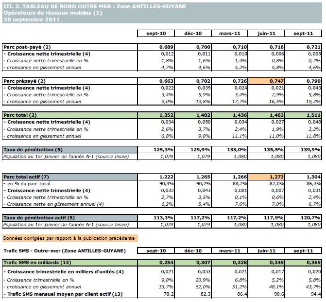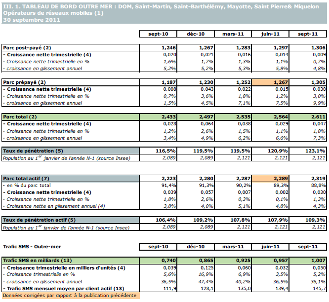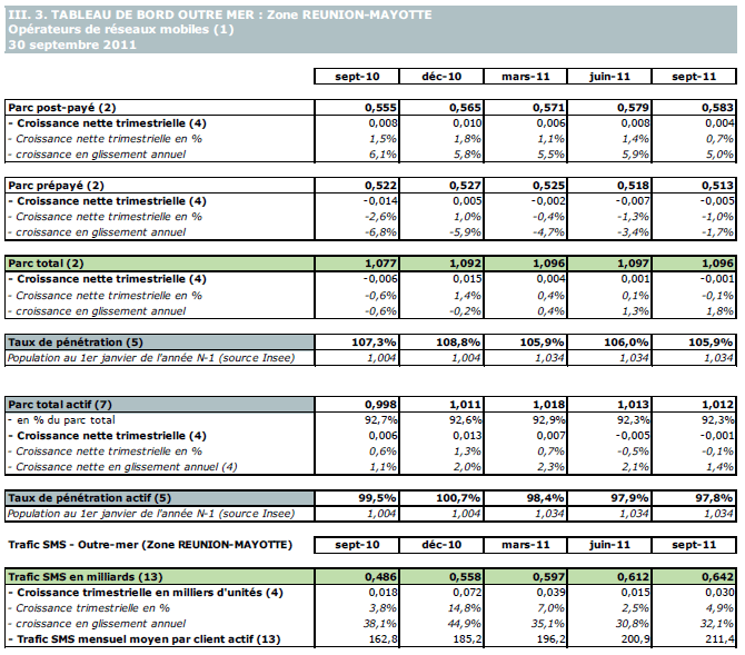(1) Opérateurs de réseaux mobiles de métropole : Orange France, Société Française du Radiotéléphone (SFR), Bouygues Telecom et MVNO actifs contrôlés par les opérateurs de réseaux : Mobisud, Ten, Neuf Cegetel et France Télécom. Opérateurs de réseaux mobiles outre-mer : Orange Caraïbe, filiale d'Orange France ; Orange Réunion, filiale d'Orange France ; Société Réunionnaise du Radiotéléphone (SRR), y compris sous la marque Mayotte Telecom Mobile à Mayotte, filiale de SFR ; Digicel AFG ; SAS SPM, filiale d'Orange Caraïbe à Saint Pierre et Miquelon ; Dauphin Telecom ; Outremer Telecom ; UTS Caraïbe.