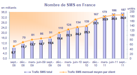 (13) Le trafic trimestriel de SMS ("Short Message Service") correspond à l'ensemble des SMS envoyés (SMS sortants) sur le trimestre. Les données relatives à St-Pierre et Miquelon ne sont pas prises en compte. Le trafic SMS mensuel par client actif moyen correspond au trafic trimestriel de SMS divisé par 3, rapporté au parc de clients actifs moyen ((Parc de clients actifs de la fin du trimestre précédent + Parc de clients actifs de la fin du trimestre considéré)/2).