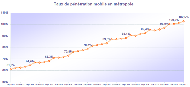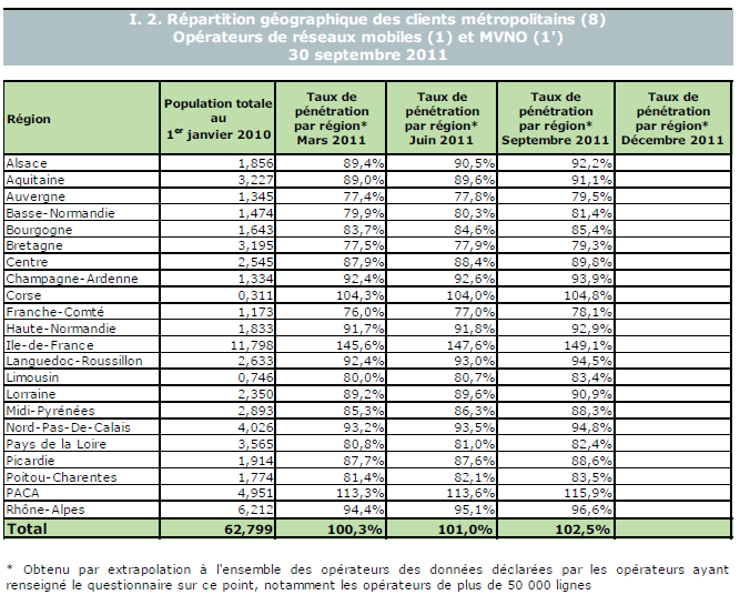 (5) Le taux de pénétration est obtenu en divisant le nombre total de clients ou le nombre de clients "actifs" par la population considérée. La publication du SIM effectuée en décembre 2006 a réactualisé les populations issues du recensement décennal de l'INSEE en date du 1er janvier 1999. Désormais la population de référence est celle publiée par l'Insee au 1er janvier de l'année considérée, sans réactualisation rétroactive. Au 1er janvier de l'année N, l'Insee publie les estimations de population du 1er janvier de l'année N-1. Ainsi, la population de référence en 2011, issue des estimations publiées en janvier 2011 (et donc portant sur la population au 1er janvier 2010), comprend une population métropolitaine de 62 799 180 personnes, à laquelle s'ajoute, au titre des DOM et des COM, une population de 2 120 750 personnes, se décomposant notamment en 1 079 954 personnes pour la zone Antilles-Guyane et 1 034 451 pour la zone Réunion-Mayotte. La population actualisée de Mayotte au 1er janvier 2010 est issue d'une estimation de la Banque mondiale.