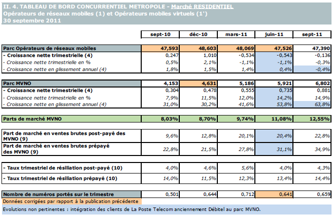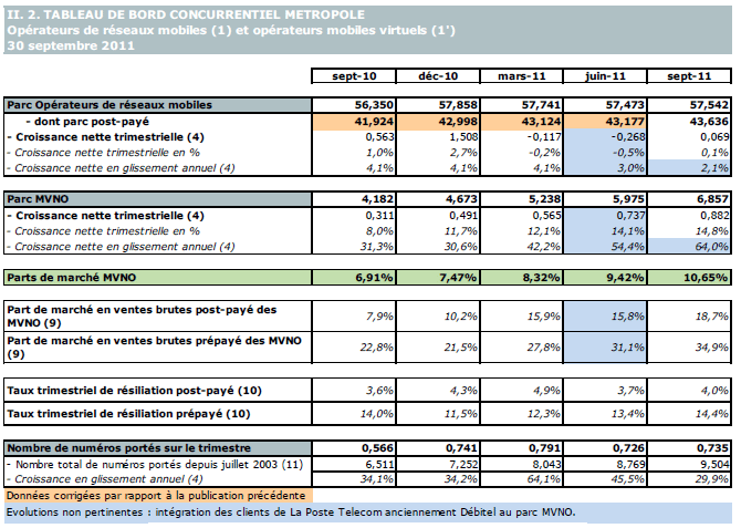 (1') Opérateurs mobiles virtuels de métropole indépendants des ORM et actifs sur le trimestre : Afone, Auchan Telecom, Bazile Telecom, Carrefour mobile, Coriolis Telecom, E-plus (KPN), IC Telecom, La Poste Telecom, Lebara mobile, Legos, Lycamobile, Mobeel, NRJ Mobile, Numéricable, Omer mobile, Omer Telecom, Ortel Mobile, Prixtel, SCT Telecom, Sim +, Sisteer, Symacom, Transatel, Zéro forfait