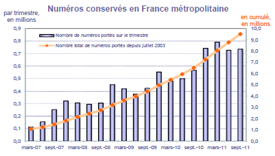 (11) Le nombre de numéros portés est calculé comme la demi-somme des volumes de numéros relatifs à des portages "in" et à des portages "out" réalisés par l'ensemble des opérateurs. On entend par portage "in" un portage effectif du point de vue de l'opérateur receveur et par portage "out" un portage effectif du point de vue de l'opérateur donneur.