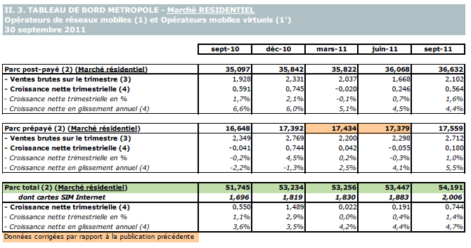 (10) Le taux de résiliation post-payé trimestriel est le rapport entre les résiliations post-payé du trimestre et le parc moyen post-payé sur la période la (demie somme des parcs post-payé en début et en fin de trimestre). Le taux de résiliation prépayé trimestriel est le rapport entre les résiliations prépayé du trimestre et le parc moyen prépayé sur la période (demi-somme des parcs prépayé en début et en fin de trimestre). A noter qu'une résiliation se définit comme un client de l'opérateur en début de trimestre dont l'enregistrement au HLR a été effacé au cours du trimestre. Les modifications de l'enregistrement au HLR ne constituent pas, en particulier, des résiliations. Cette définition ne recouvre donc ni les changements d'offres au sein de la gamme, ni les migrations prépayé vers post-payé ou post-payé vers prépayé, ni les suspensions de services.
