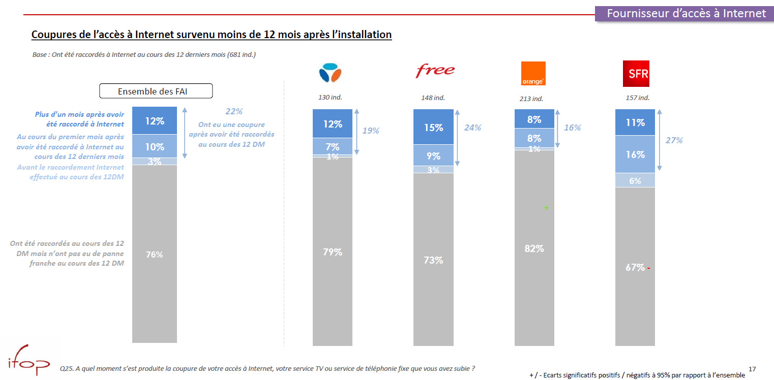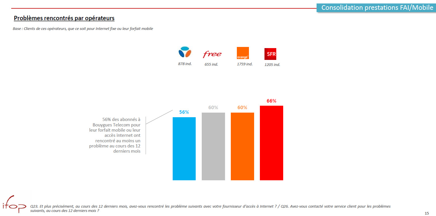 - En agrégeant les réponses pour les opérateurs mobiles et les fournisseurs d’accès à internet fixe, les répondants déclarent avoir rencontré un problème avec leur opérateur au cours des 12 derniers mois pour 66% d’entre eux lorsqu’ils sont clients de SFR, 56% chez Bouygues Telecom, 60% chez Orange et 60% chez Free.