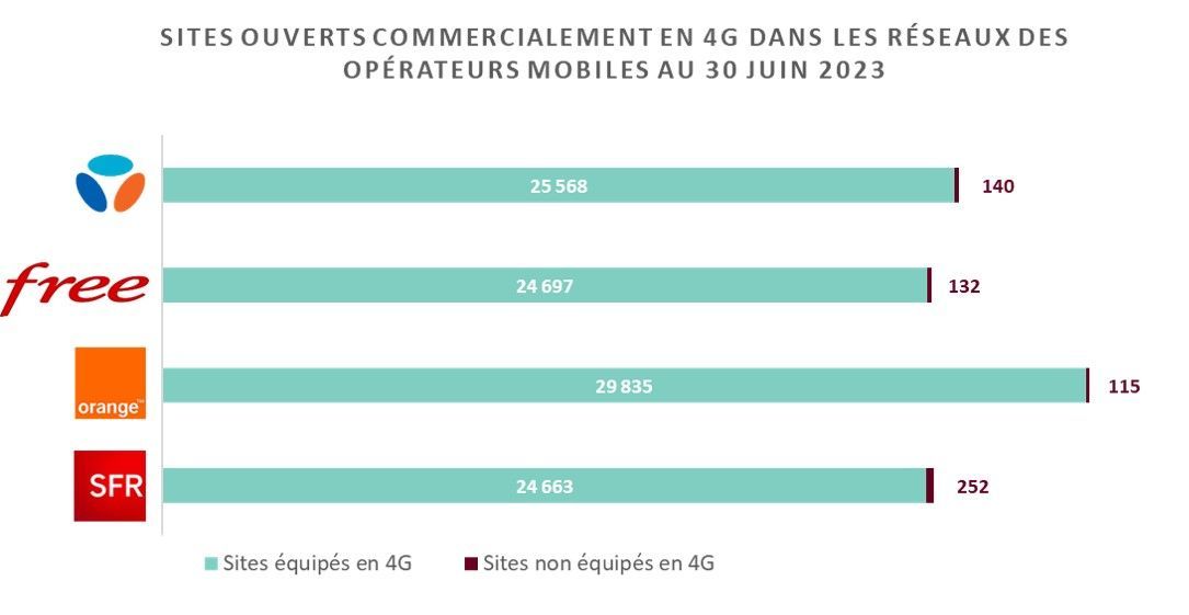 Parmi les sites ci-dessus, au 30 juin 2023, près de 98 % des sites du programme « zones blanches centres-bourgs » existants au 1er juillet 2018, étaient équipés en 4G.