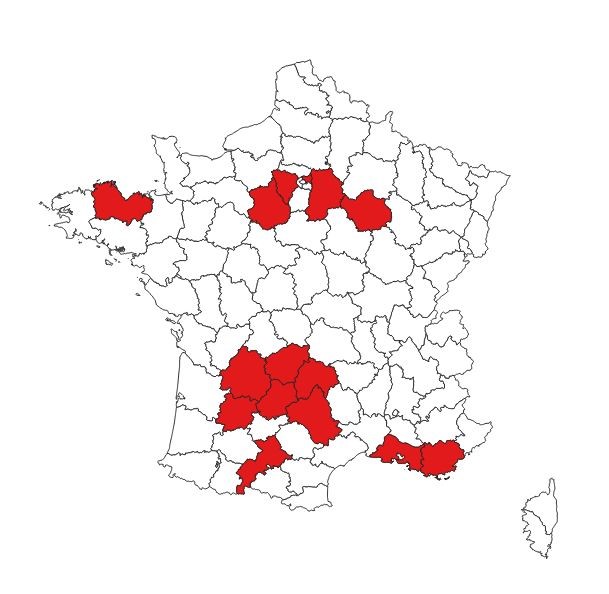 Départements où des conditions techniques spécifiques pourront être nécessaires : Aube (10), Bouches-du-Rhône (13), Corrèze (19), Côtes d’Armor (22), Creuse (23), Dordogne (24), Drome (26), Gard (30), Garonne (31), Bas-Rhin (67), Paris (75), Seine-et-Marne (77), Yvelines (78), Tarn (81), Tarn-et-Garonne (82), Var (83), Vaucluse (84), Haute-Vienne (87), Yonne (89), Essonne (91), Hauts-de-Seine (92), Seine-Saint-Denis (93), Val-de-Marne (94), Val d’Oise (95).