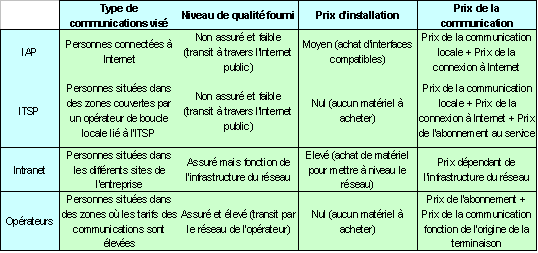 Globalement, une qualité dite " acceptable " peut être mise en œuvre dés aujourd’hui. Elle nécessite cependant des solutions de type Voix sur IP. En effet, la Voix sur Internet conduira à une qualité dégradée.