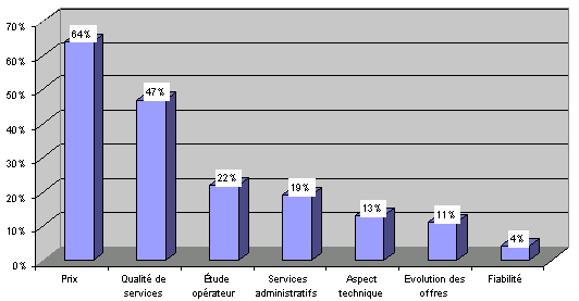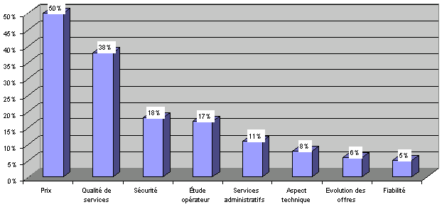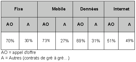 * opérateurs classés par ordre alphabétique. Liste non exhaustive. L’INTENSITE DE LA CONCURRENCE Etat de la concurrence Les entreprises estiment que la concurrence est effective au niveau des communications interurbaines et internationales. En revanche, l'avis sur le degré de concurrence dans les communications fixe vers mobiles (poste en forte croissance dans l’ensemble des entreprises rencontrées) est plus mitigé. Les entreprises estiment que la concurrence dans les mobiles existe. Les entreprises estiment que la concurrence est effective dans les domaines Internet avec une profusion d’offres. Toutefois, certaines entreprises restent méfiantes sur la qualité de ces offres. Les entreprises estiment que la concurrence est limitée, voire absente, au niveau de la boucle locale (fixe et données). Les attentes sont importantes, essentiellement pour les entreprises présentes en province. Les politiques d’achats Centralisation Les grandes entreprises centralisent peu leurs achats de services de télécommunications en 2000 : elles possèdent donc une vision partielle de leurs dépenses dans ce domaine. Du fait de cette absence de centralisation, les grandes entreprises ne profitent pas forcément de réduction de tarifs ; ceci se vérifie pour la téléphonie fixe et mobile, mais aussi pour les données et Internet (dans une moindre mesure). Il leur est par conséquent difficile de négocier des contrats-groupe permettant de bénéficier de réductions au volume. Toutefois, des changements sont en train de se produire et une évolution très marquée vers une plus grande centralisation est en cours dans un nombre non négligeable d’entreprises. Afin de mettre en place un processus d’achat centralisé par le siège, les entreprises prennent les mesures suivantes : - désignation d’un responsable télécommunications au siège de l’entreprise avec la responsabilité de coordonner les besoins des sites, - évaluation détaillée des dépenses en télécommunications : fixes, mobiles, données, Internet et mise en place d’outils de reporting; - évaluation du parc de mobiles (jusqu’à présent non recensé par les grandes entreprises); - signature de contrats cadre; - utilisation de tous les moyens disponibles pour se tenir informé des évolutions d’offres sur le marché. Appels d’offres Les achats en services de télécommunications se font majoritairement par appels d’offres : - 70% des sociétés procèdent à leurs achats par appels d’offres pour la téléphonie fixe; - 73% des sociétés procèdent à leurs achats par appels d’offres pour la téléphonie mobile; - 69% des sociétés procèdent à leurs achats par appels d’offres pour les services avancés; - 51% des sociétés procèdent à leurs achats par appels d’offres pour les transmissions de données (dont Internet). Cependant un appel d’offre est lourd à mettre en place, en terme de temps (suivi des offres des opérateurs, durée moyenne de 6 à 12 mois, mobilisation en permanence d'une ou plusieurs personnes), de coûts (changement éventuel de numéro de téléphone avec des conséquences commerciales lourdes pour l'entreprise, suivi technique, mise en place du réseau, …). Critères de choix des opérateurs Dans le choix d’un opérateur, le prix est le premier critère de sélection pour tous les services. Cependant, la qualité de services, deuxième critère cité, suit de très près les prix pour les données et Internet. THEMES DE DISCUSSIONS Le dernier point de cette conclusion rassemble les sujets qui reflètent le plus souvent les préoccupations, voire les insatisfactions des grandes entreprises (les thèmes ne sont pas classés par ordre d'importance) : • Communications fixe vers mobiles : ce type de communication a fortement augmenté en 1999 et 2000 ; ce poste de dépenses préoccupe les sociétés qui s'inquiètent à la fois de la croissance de cette dépense, du coût à la minute et du manque de concurrence sur ce segment. Rappelons que pour certaines sociétés les appels fixe vers mobiles représentent jusqu'à 40% de leur facture fixe. • Communications locales : alors que la majorité des sociétés estiment que la concurrence sur les communications interurbaines et internationales est effective, les communications locales restent sous un quasi-monopole de France Telecom. Les sociétés attendent donc avec impatience le dégroupage et le déploiement des boucles locales, radio ou filaires. La revendication est encore plus vive de la part des sociétés présentes en Province. • Services avancés : les grandes entreprises estiment que la concurrence y est faible et s’en plaignent. Elles sont également particulièrement nombreuses à déplorer l’absence de portabilité des numéros de services avancé. En effet, comme le numéro est le point de contact privilégié entre la société et son client et fait partie de l’"identité" de l’entreprise, l'absence de portabilité des services avancés lie actuellement l’entreprise à l’opérateur de façon quasi-définitive car le changement de numéro se traduit par la perte d'une partie de sa clientèle. Par ailleurs, nombre de sociétés se plaignent du coût élevé de la mise en place de services avancés, en particulier pour les sociétés possédant des centres d’appels. • Augmentation des débits dans les transmissions de données : ce besoin se fait sentir de façon quasi systématique, quel que soit le secteur d’activité. Il est particulièrement fort dans les banques, les organismes de recherches, les industries et le transport. • Roaming : c’est un problème très important pour les sociétés dont les employés se déplacent à l’étranger. Cette facture augmente de façon très rapide car les prix à la minute sont extrêmement élevés. Le sentiment général sur cette question fait ressortir un manque de concurrence évident à l’échelle européenne. • Portabilité des 