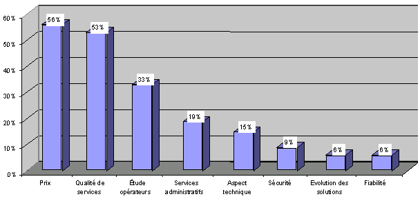 MOYENS UTILISES POUR LES ACHATS DE SERVICES EN TELECOMMUNICATION 4.2. Les politiques d’achat par appels d’offres 4.2.1 Critères de choix par appel d’offres Lorsque les entreprises organisent un appel d’offre, elles choisissent leurs opérateurs sur différents critères qui varient en fonction de la nature de l’achat : voix, données. 4.2.1.1 Téléphonie fixe et mobile Le critère de sélection dans un appel d’offre fixe ou mobile, le plus souvent cité est le prix. C’est un élément déterminant pour passer à la concurrence. La qualité de services arrive en seconde position. Les entreprises regardent ensuite l’aspect administratif proposé par les différents opérateurs contactés (reporting, facturation) puis la solidité financière de l’opérateur (actionnariat), la pérennité (expérience), la couverture géographique de son offre (présence européenne, voire mondiale…). L’aspect technique de la solution proposée arrive en cinquième position, que ce soit au niveau du fixe ou du mobile.