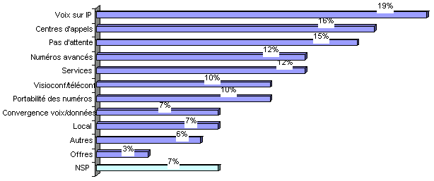 Cette centralisation peut prendre plusieurs formes : Quelles sont les attentes des entreprises en fonction des avancées technologiques ? Les projets de voix sur IP ont été le plus fréquemment cités (19%). Des projets liés aux centres d’appels et parallèlement à des services avancés, arrivent respectivement en seconde et troisième position. Les projets de centres d’appels concernent à la fois les aspects internes (assistance informatique…) et externe (utilisation commerciale…). Les systèmes de visio-conférence ou téléconférence arrivent ensuite. La portabilité des numéros standards ou avancés arrive également dans les évolutions prévues par les grandes entreprises en fonction de sa mise en place effective.