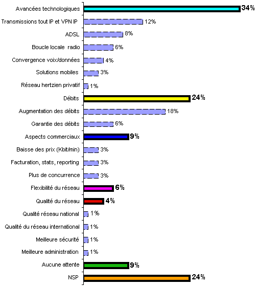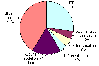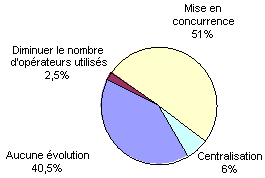 raisons invoquées sont les suivantes : 16% des entreprises n’ont pas de vision sur l’évolution de leur politique d’achats. Les raisons invoquées sont : des projets à venir mais dont le mode (appels d’offres, autres) ou la date ne sont pas encore définis ou des attentes de mûrissement des propositions commerciales et techniques des opérateurs (voix sur IP par exemple). 7% des entreprises souhaitent réaliser des appels d’offres globaux au niveau européen voire mondial. La centralisation de la gestion des achats auprès d’un nombre réduit d’opérateurs de dimension internationale est une préoccupation récente d’entreprises présentes dans plusieurs pays. 3% des sociétés souhaitent centraliser leur processus d’achat.
