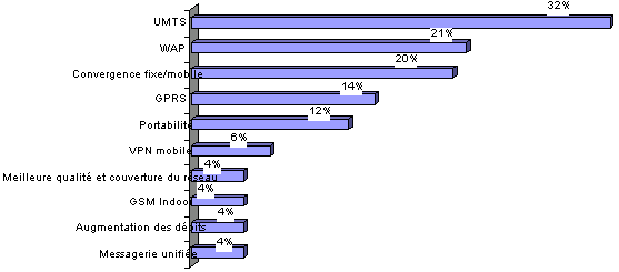 ÉVOLUTION DES POLITIQUES D’ACHATS : TÉLÉPHONIE MOBILE Quelles sont les attentes des entreprises en fonction des avancées technologiques ? Les attentes dans ce domaine sont grandes à moyen terme, mais faibles à court terme. À court terme, le WAP ne convainc pas, mais reste tout de même une source d’attente mentionnée par 21% des sociétés. Le GPRS est mentionné par 14% des sociétés pour l’augmentation des débits qu’il procurera dans les transmissions de données par téléphone mobile. À moyen terme, les grandes entreprises présentes en France misent principalement sur l’UMTS, mentionné par 32% d’entre eux. À plus long terme, la convergence fixe/mobile intéresse déjà 19% des sociétés.