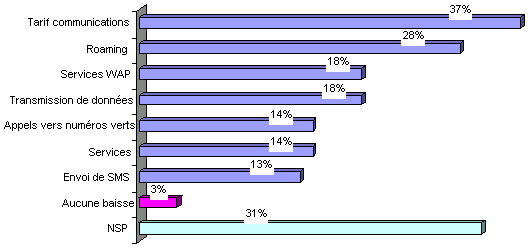 ATTENTES DES GRANDES ENTREPRISES EN FONCTION DES AVANCÉES TECHNOLOGIQUES : MOBILE Sur quels types de services mobiles les entreprises attendent-elles des baisses substantielles de prix ? Les attentes au niveau des baisses de prix sont très variées. La baisse du prix des communications est une requête citée par 37% des grandes entreprises. Vient ensuite le roaming qui représente jusqu’à 50% de la facture mobile dans certaines sociétés où les employés sont amenés à voyager hors de France. Les services WAP viennent en troisième position (une préoccupation de 18% des sociétés), ex-æquo avec les transmissions de données par les mobiles. La baisse des prix des communications vers les numéros "libre appel" (qui sont payants à partir des mobiles) est une requête pour 14% des sociétés, en particulier celles dont la flotte de commerciaux utilisent souvent ce type de numéro.