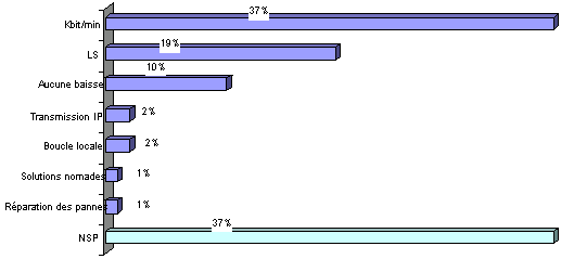 ATTENTES DES GRANDES ENTREPRISES EN FONCTION DES AVANCÉES TECHNOLOGIQUES : DONNÉES Sur quels types de services de données les entreprises attendent-elles des baisses substantielles de prix ? De nombreux thèmes sont récurrents dans les attentes des entreprises. Tout d’abord, elles attendent une baisse du prix du Kbit (37%) et une baisse du prix des liaisons louées (19%).