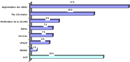 ÉVOLUTION DES POLITIQUES D’ACHATS : INTERNET Quelles sont les attentes des entreprises en fonction des avancées technologiques ? L’augmentation des débits semble être la première préoccupation des grandes entreprises. Les entreprises sont un grand nombre à ne pas avoir d’attentes ou d’avis sur le sujet. Dans ce dernier cas, elles invoquent fréquemment l’impact des nouvelles technologies et leur pertinence. La sécurité fait également partie des préoccupations de ces sociétés. Les autres projets des entreprises regroupent : des projets liés à l’Intranet/Extranet de l’entreprise qui ont un impact moins important sur les opérateurs ou ISP, des projets de places de marché et des projets de commerce électronique.