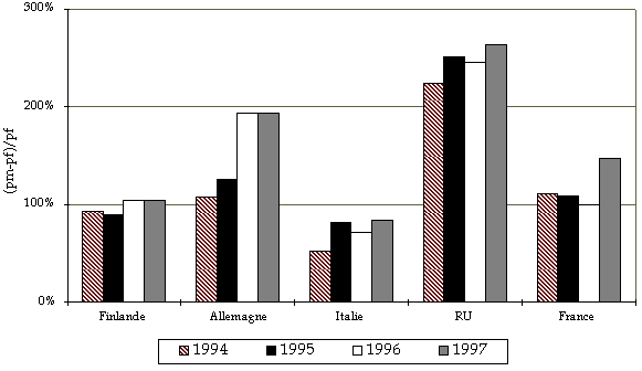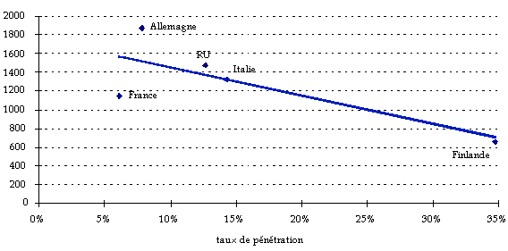 dans le temps et aux tarifs fixes. La relation des tarifs mobiles à la richesse des pays s'observe à travers la corrélation par exemple entre la valeur du panier moyen de l'abonné mobile 1 et la parité du pouvoir d'achat (PPA). Ce premier exercice permet de relativiser le niveau absolu des prix. Sur les 5 pays renseignés ici, deux ont ainsi des positions extrêmes : l'Allemagne, avec des tarifs mobiles qui, même ramenés au niveau de vie, sont relativement élevés et la Finlande qui, à l'inverse, propose des tarifs très bas. On observe dès lors une forte corrélation (inverse) entre le niveau des tarifs et les taux de pénétration. On note également sur le graphique qui suit le retard de la France, qui s'est toutefois partiellement résorbé depuis (les données produites ici sont celles de mi-97).