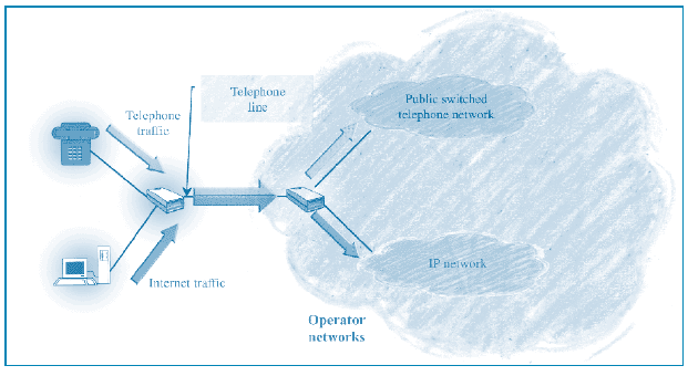 • Internet traffic is carried on the copper pair just like telephone traffic, from the user’s computer to a distribution frame, the first element on the switched telephone network. At this point, it is separated from telephone traffic and routed to a separate IP network.