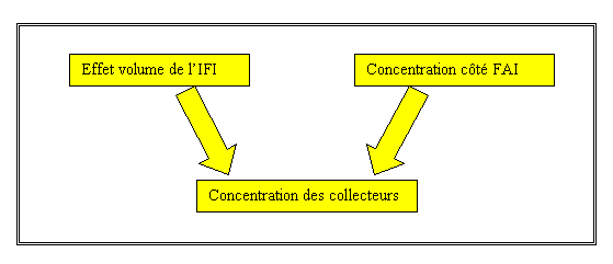 III.2.1. Une poursuite probable de la concentration côté FAI et côté collecteurs En 2002, le mouvement de concentration côté FAI et côté " collecteurs " pourrait se poursuivre en 2002. La concentration du côté de la demande est déjà très avancée : trois acteurs (AOL, Club Internet et Tiscali) représentent quasiment 100% du marché non captif. Un opérateur ne collectant pas une partie du trafic de l’un de ces trois acteurs est voué à sortir du marché. Même si les FAI ont tendance à s’approvisionner auprès de 2 ou 3 collecteurs, la concentration de la demande devrait entraîner une réduction du côté des fournisseurs. L’effet volume de l’IFI favorise également une réduction du nombre de collecteurs puisque ceux-ci doivent atteindre un volume de trafic critique pour profiter à plein de l’IFI et rester compétitif. L’IFI pourrait indirectement favoriser l’achèvement de la concentration côté FAI dans la mesure où l’effet volume de l’IFI peut inciter les opérateurs à proposer des
