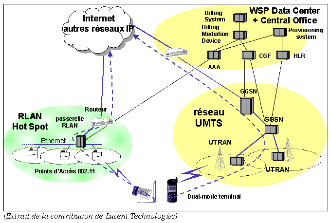 Même si les premières solutions existent déjà, l’interconnexion des RLAN (les interfaces 802.11 et Hiperlan2 sont les plus citées) avec les réseaux mobiles de seconde et troisième génération apparaît plus délicate que dans le cas des réseaux fixes. Au stade actuel, seules des solutions propriétaires semblent pouvoir garantir un handover sans coupure entre RLAN et GPRS. Plusieurs acteurs du mobile notent qu'une solution est disponible sur le marché, consistant à utiliser la chaîne de gestion des abonnés mobiles via l’insertion d’une carte SIM dans le terminal RLAN,.