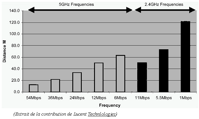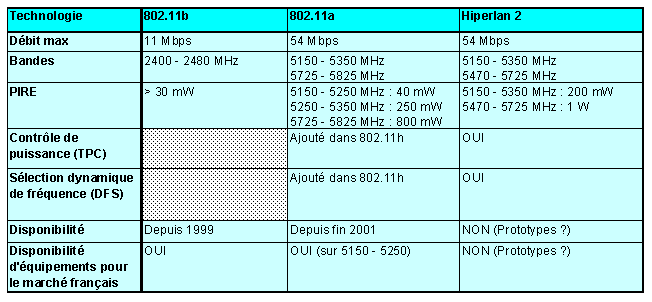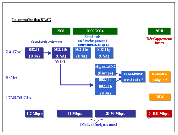 A l’heure actuelle, les trois technologies disponibles pour des équipements sans fil dans la bande de fréquence 2,4 GHz sont Bluetooth, Home RF et Wi-Fi (Wireless Fidelity, norme IEEE 802.11b). Bluetooth offre des débits de 1 Mbit/s sur un rayon limité de l’ordre de 10 à 30 mètres avec une puissance des terminaux faible de l’ordre de 10 mW et Wi-Fi offre un débit théorique de 11 Mbit/s avec un rayon d’action de l’ordre de 50 à 100 mètres et une puissance isotrope rayonnée équivalente (PIRE) de 100 mW. Cette dernière technologie est compatible avec Ethernet ce qui permet des applications dans les réseaux locaux d’entreprises. Les deux technologies sont déjà disponibles et des évolutions de la 802.11b se font d’ores et déjà jour. La norme 802.11a est également finalisée et porte le débit à 54 Mbit/s dans la bande de fréquence des 5 GHz bien qu'elle ne soit utilisable que dans la bande 5150-5250 MHz. Les normes Hiperlan 2 et 802.11 h sont en cours de finalisation.