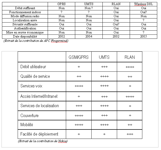 Tableaux comparatifs des technologies GSM/GPRS, UMTS et RLAN selon deux contributions