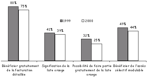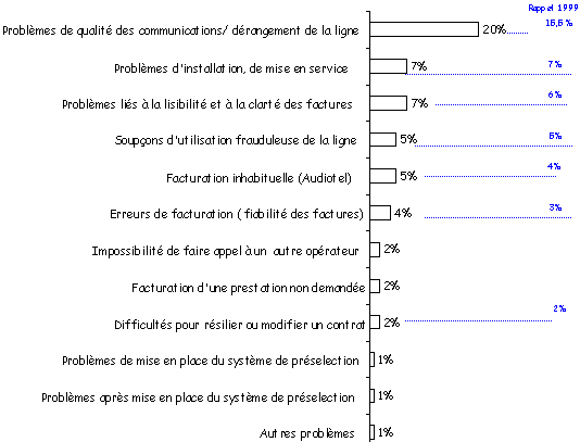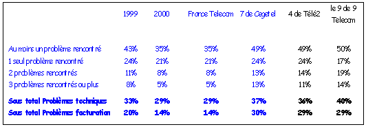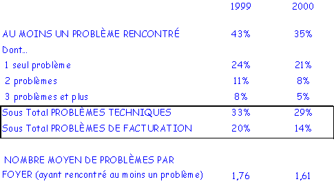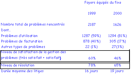 Le taux de problèmes rencontrés en téléphonie fixe a baissé par rapport à 1999 (35% contre 43%). Le taux de problèmes techniques a perdu 4 points et celui de la facturation 6 points.