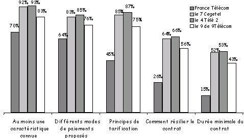 Les clients des nouveaux entrants qui déclarent avoir lu leur contrat et ses annexes tarifaires, se montrent plus attentifs au contenu que pour le contrat France Télécom : plus de 90% connaissent au moins une des quatre caractéristiques du contrat de l’opérateur dont ils sont clients, contre 70% pour France Télécom. Chez les nouveaux opérateurs, l’élément du contrat le plus connu concerne, comme en 1999, les conditions tarifaires, alors que ce sont les modes de paiement proposés qui sont la donnée la plus connue des contrats avec France Télécom. La connaissance des conditions générales des contrats