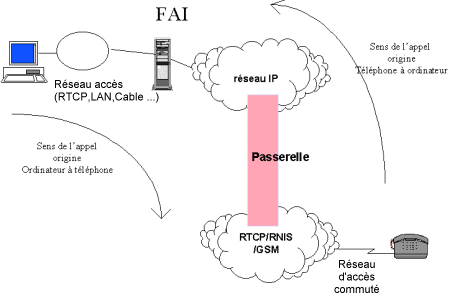 - l’utilisation de passerelles RTC/IP, qui convertissent la voix circuit en " voix sur IP " ; - la mise en oeuvre de fonctions et de protocoles spécifiques (H323, garde barrière(1), etc.) contrôlant un réseau de transport IP, réseau qui peut être dédié (dorsale appartenant à un réseau opérateur d’opérateur) ou partagé (Internet " public "), pour assurer le transfert des paquets contenant la voix.