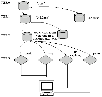 III.3 Implementation at the national level The conditions of implementation of the ENUM protocol are currently under discussion in various international bodies. They are therefore not made official. The models for implementation identify three levels of players: - Tier 0: the registry of the domain under which ENUM is implemented (see III.2). It maintains an Internet domain name server which recognises the ENUM subdomain servers for the various country codes ("Level 1" below). For example, a query sent to the Tier 0 server on the name "www.0.0.0.7.7.4.0.4.3.3.xxx" is rerouted to the server responsible for subdomain "3.3.xxx". Questions related to the insertion of E.164 numbers in the DNS lead ART to recommend that the ITU be designated at Tier 0 (cf. III-1 and III-2). - Tier 1: the governments are responsible for the domain corresponding to their country code(s), and designate an entity responsible for managing the subdomain(s). A Tier 1 entity is the equivalent of the registry of a "ccTLD"15, i.e. AFNIC for ".fr". - Tier 2: a Tier-2 body is responsible for registering the numbers of the end users in the domain "3.3.xxx". For Internet domain names, this tier corresponds to Internet Registrars, those bodies authorised to register names. In addition to registering numbers as domain names, the Tier 2 maintains a database linking each ENUM domain name with the communication services providing access to the end user (cf. II.4). An ENUM domain name must be stored by a single Tier 2 service provider16. - Tier 3: communication service providers. The database of a Tier 2 service provider routes to the service provider servers (gateway to IP telephony, messaging server, etc.). The diagram below shows the tiers explained above: