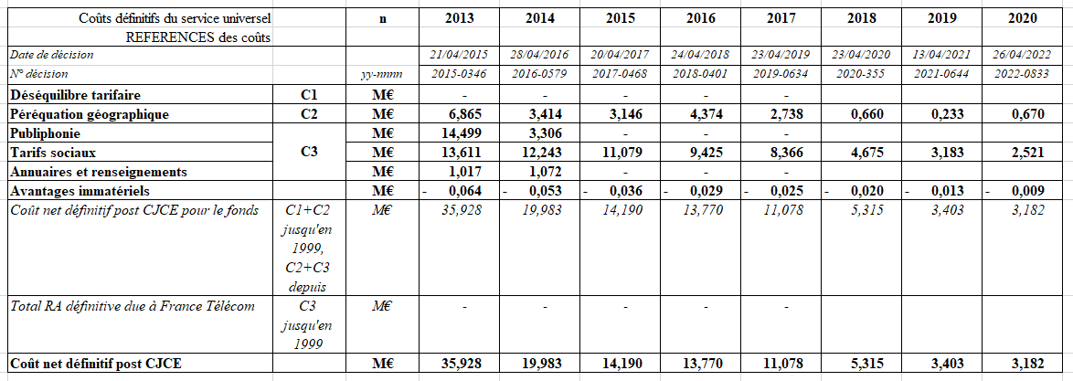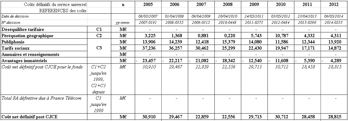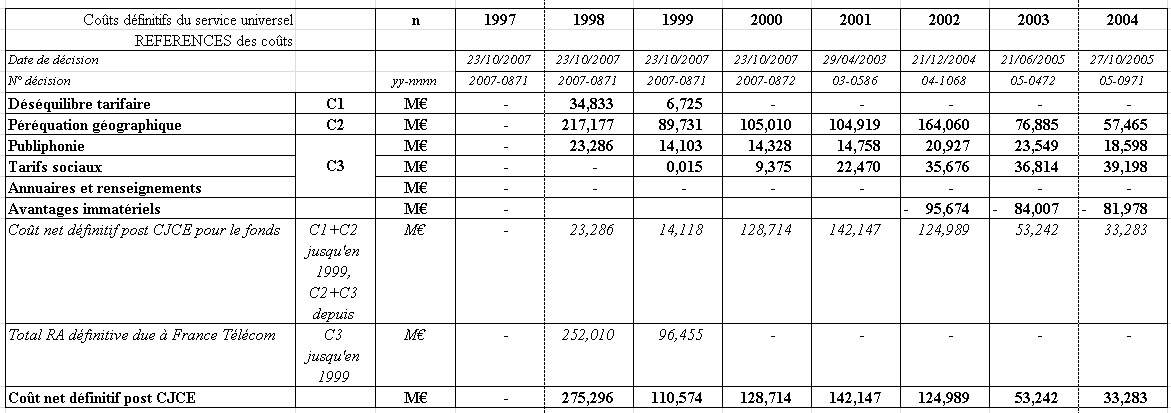 Les tableaux ci-dessous récapitulent les différentes composantes du calcul du coût net définitif du service universel et leur évolution depuis 1997 :