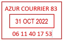 (nom commercial : Azur Courrier 83) | 13/12/2022 Décision n° 22-2530 | Azur Courrier 83, 12 chemin des Cades, 83320 CARQUEIRANNE Contact : Mail : bruno.sallé83(@)gmail.com Téléphone : 06 11 40 17 43 de 8h à 20h, 7 jours sur 7 | Voir le marquage (jpg - 12,98 Ko) | Services d’envois de correspondance incluant la distribution. Territoire desservi : Communauté d'agglomération Toulon-Provence-Méditerranée. |