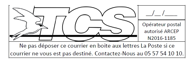 TCS Voir le logo (jpg - 11,15 Ko) | 20/09/2016 Décision n° 16-1185 | 3, rue Joseph BONNET 33100 BORDEAUX Téléphone 05 57 54 10 10 | Voir le marquage (jpg - 60 Ko) | Services d’envois de correspondance incluant la distribution. Zone de commercialisation :France entière |