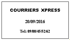 COURRIERS XPRESS Voir le logo (jpg - 7,50 Ko) | 11/10/2016 Décision n° 16-1279 | 885, rue Louis BREGUET, 62100 CALAIS Téléphone 09 80 45 52 62 - 06 37 95 44 97 | Voir le marquage (jpg - 7,87 Ko) | Services d’envois de correspondance incluant la distribution. Zone de commercialisation : départements du Nord et du Pas-de-Calais |