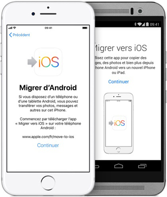 Si vous êtes utilisateur du système Android et que vous souhaitez changer de système d'exploitation mobile pour une version d'iOS, alors vous pouvez utiliser la solution " Migrer vers iOS ". Cette application gratuite est disponible dans les magasins d'applications des équipements mobiles disposant d'Android 4.0 ou d'une version ultérieure. Elle vous permet, via un réseau Wi-Fi, de transférer les contacts, les historiques de messages, les photos et vidéos de l'appareil photo, les comptes de messagerie, les calendriers ainsi que les applications gratuites lorsque celles-ci sont également disponibles sur l'Appstore.