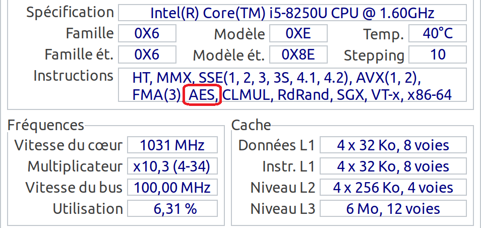 - macOS : Télécharger MacCPUID sur software.intel.com. Lancer MacCPUID. Dans l’onglet « Features », vérifier que « AES » est supporté ;