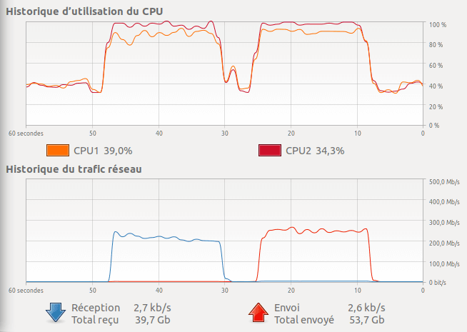 Le graphique représente la charge moyenne du processeur sur un intervalle de temps. Afin de garantir que le test de qualité de service ne soit pas limite, il faut que le pourcentage d’utilisation du processeur ne dépasse pas 70% pendant le test.
